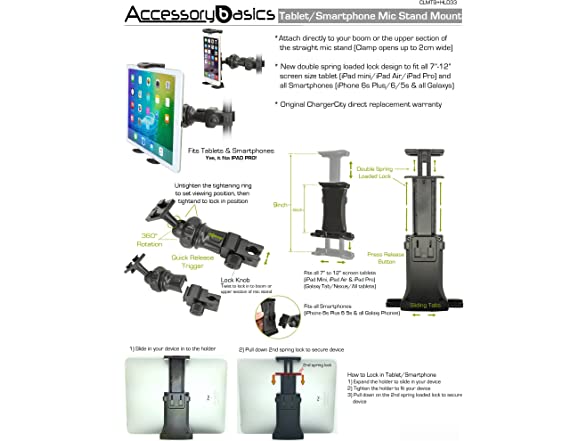 In the Box: (1) AccessoryBasics EasyAdjust cymbal Microphone Mic Stand Tablet Mount for Most Tablets & Large Size Cell Phones Smartphone (Zoom Compatible)