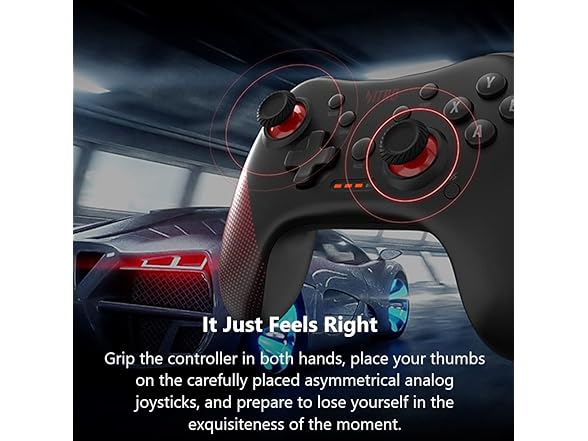 - It Just Feels Right: Grip the controller in both hands and place your thumbs on the carefully placed asymmetrical analog joysticks