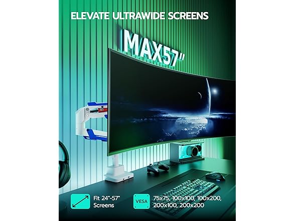 - 【Ultrawide Screen Compatibility】The monitor arm supports screens up to 57 ", including flat and curved displays weighing up to 52.8 lbs and 66 lbs. The included VESA adapters fits monitors with 75x75 mm, 100x100 mm, 100x200 mm, 200x100 mm and 200x200 mm VESA patterns. The monitor mount is built to handle ultrawide screens, compatible with the Samsung Odyssey G9, LG, and other ultra wide monitors