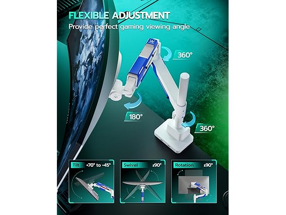 - 【Flexible Adjustment】The fully adjustable monitor stand offers a wide range of motion, including +70 ° to -45 ° tilt, +90 ° to -90 ° swivel, 360 °rotation and a gas spring lift for smooth height adjustments. This allows you to position your monitor at the perfect height and angle for your needs, reducing neck and eye strain. With the maximum height of 25.8 " and extension of 25.8 ", it can meet your optimal ergonomic posture for a comfortable working, gaming, and viewing experience