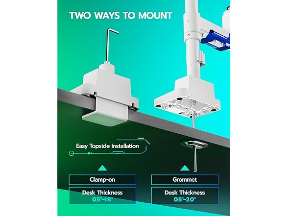 - 【Easy Installation】The desk mount is easy to install with two desktop mounting options, the C-clamp mount fitting for desks of 0.47-1.77 " and the grommet mount fitting for 0.47-1.97 ". The included mounting hardware, clear instruction manual, and online supplementary assembly video ensure a quick and easy installation. Please measure your table thickness before purchasing to ensure the compatibility