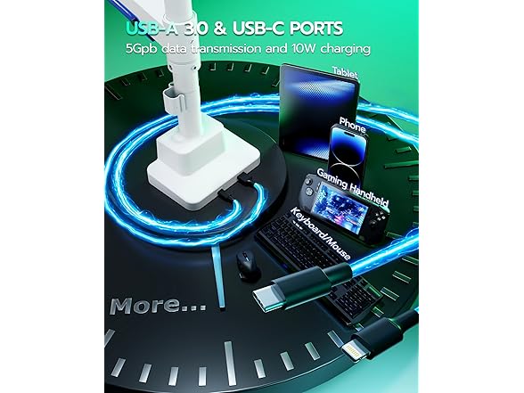 - 【Smart USB Integration】Designed with a smart base with USB function, this heavy duty monitor arm helps you connect your devices easily and effortlessly. The built-in USB-A 3.0 and USB-C ports expand on the ports easily available to you on your desk, providing convenient options for charging and data transmission. The two integrated USB ports allows simultaneous charging for your two devices at any time