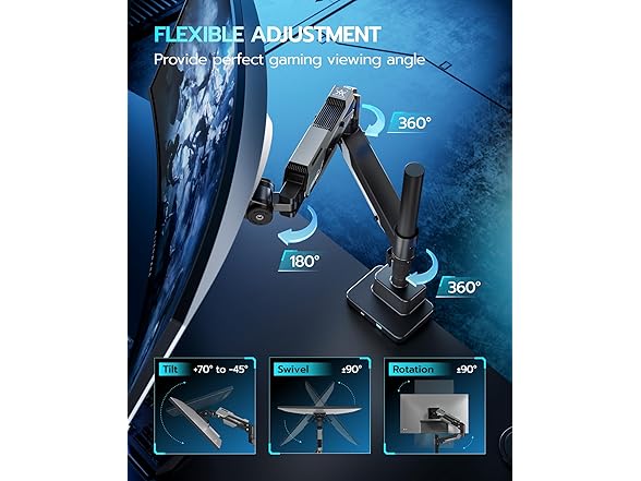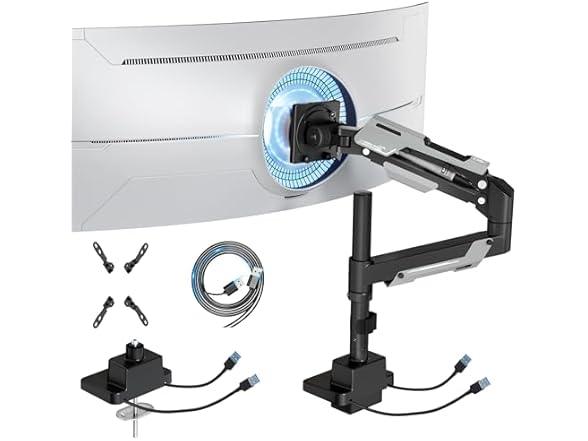 Support ultrawide monitors up to 57" and 66 lbs, including Samsung Odyssey G9. This heavy-duty monitor arm offers full motion adjustment, 360° rotation, +70°/-45° tilt, and 25.8" max height. Built with durable aluminum and steel, it features USB-A & USB-C ports, cable management, and saves desk space. Easy install with C-clamp/grommet options. VESA compatible: 75x75 to 200x200.
