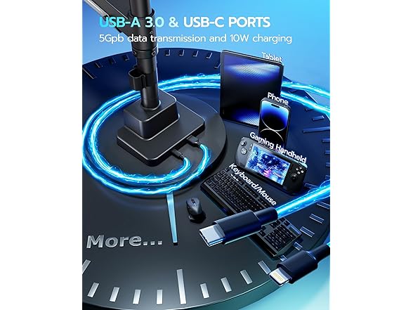 - 【Smart USB Integration】Designed with a smart base with USB function, this heavy duty monitor arm helps you connect your devices easily and effortlessly. The built-in USB-A 3.0 and USB-C ports expand on the ports easily available to you on your desk, providing convenient options for charging and data transmission. The two integrated USB ports allows simultaneous charging for your two devices at any time