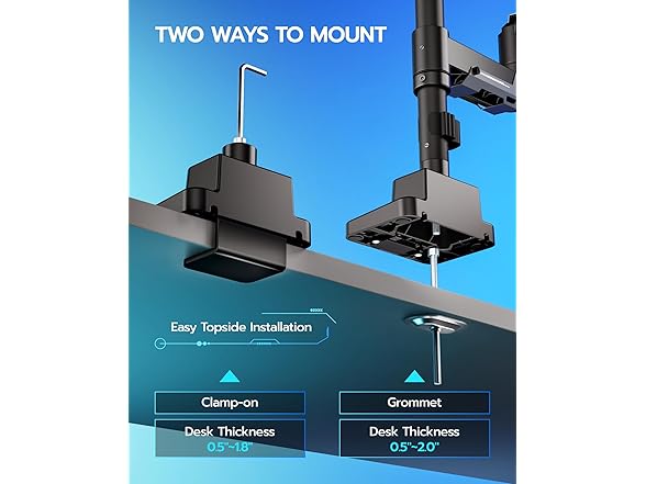 - 【Easy Installation】The desk mount is easy to install with two desktop mounting options, the C-clamp mount fitting for desks of 0.47-1.77 " and the grommet mount fitting for 0.47-1.97 ". The included mounting hardware, clear instruction manual, and online supplementary assembly video ensure a quick and easy installation. Please measure your table thickness before purchasing to ensure the compatibility