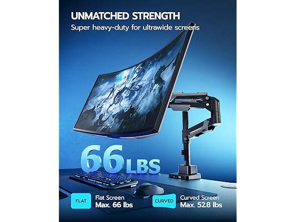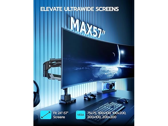 - 【Ultrawide Screen Compatibility】The monitor arm supports screens up to 57 ", including flat and curved displays weighing up to 52.8 lbs and 66 lbs. The included VESA adapters fits monitors with 75x75 mm, 100x100 mm, 100x200 mm, 200x100 mm and 200x200 mm VESA patterns. The monitor mount is built to handle ultrawide screens, compatible with the Samsung Odyssey G9, LG, and other ultra wide monitors