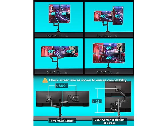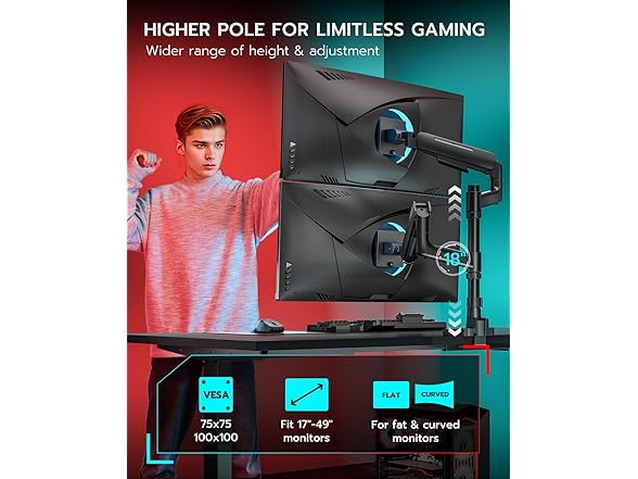 - 【Support up to 49" & 44lbs Monitors】The dual monitor mount is compatible with 17-49 inch Odyssey G9, LG, and other 49-inch monitors, including QLED, OLED, LED flat, and curved screens. Each mount for this monitor mount dual can hold monitors up to 44 lbs and is equipped with 75x75mm and 100x100mm VESA mounting holes. Note that a VESA adapter is required if your monitor does not have VESA holes.