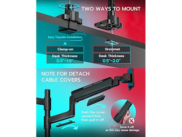 - 【Quick installation】Our computer monitor stand provides two mounting ways, C-clamp mount(for desks 0.5"-1.8") and grommet mount(for desks 0.5"-2"). It avoids the complex installation steps of traditional mounts, allowing for an easy setup without the need to crouch under the desk. With the upgraded quick-release panel and clear video instructions, installing the tall monitor arm is very simple.