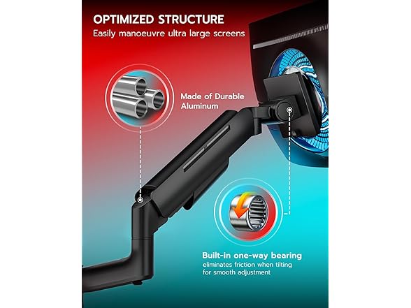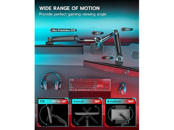 - 【Flexible Adjustment】The dual monitor arms adjust to a maximum height of 28.4 inches, with arms extending 21.8 inches. Featuring a stable premium gas spring and an upgraded head structure, it allows for -50° to +20° tilt, ±90° rotation, and 360° swivel. This monitor dual mount accommodates various screen layouts, optimizing your desktop space and providing an exceptional comfort experience for gaming or viewing.