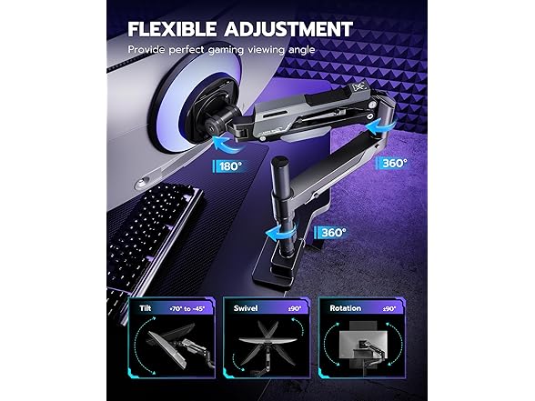 - 【Flexible Adjustment】The fully adjustable monitor stand offers a wide range of motion, including +70 ° to -45 ° tilt, +90 ° to -90 ° swivel, 360 °rotation and a gas spring lift for smooth height adjustments. This allows you to position your monitor at the perfect height and angle for your needs, reducing neck and eye strain. With the maximum height of 25.8 " and extension of 25.8 ", it can meet your optimal ergonomic posture for a comfortable working, gaming, and viewing experience