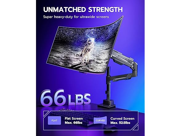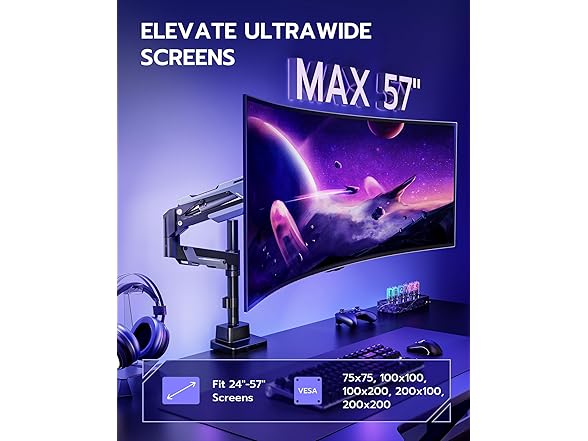 - 【Ultrawide Screen Compatibility】The monitor arm supports screens up to 57 ", including flat and curved displays weighing up to 52.8 lbs and 66 lbs. The included VESA adapters fits monitors with 75x75 mm, 100x100 mm, 100x200 mm, 200x100 mm and 200x200 mm VESA patterns. The monitor mount is built to handle ultrawide screens, compatible with the Samsung Odyssey G9, LG, and other ultra wide monitors