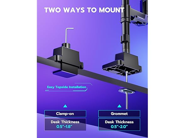 - 【Easy Installation】The desk mount is easy to install with two desktop mounting options, the C-clamp mount fitting for desks of 0.47-1.77 " and the grommet mount fitting for 0.47-1.97 ". The included mounting hardware, clear instruction manual, and online supplementary assembly video ensure a quick and easy installation. Please measure your table thickness before purchasing to ensure the compatibility
