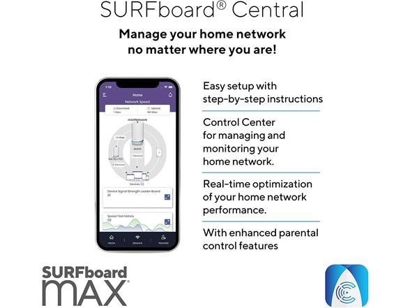- Simple and Secure Set-up: The SURFboard Central app provides step-by-step instructions to set-up, configure and manage your network. Once setup is complete, the app provides real-time monitoring of the devices on your network, enhanced parental controls like setting time limits, pausing internet, QoS, guest network, parental control rules, and much more!