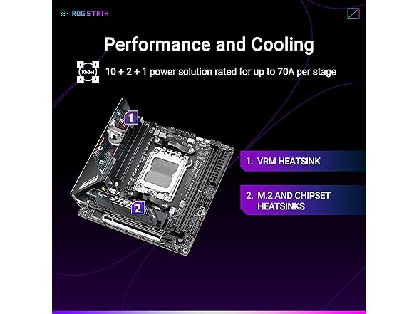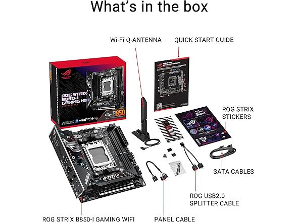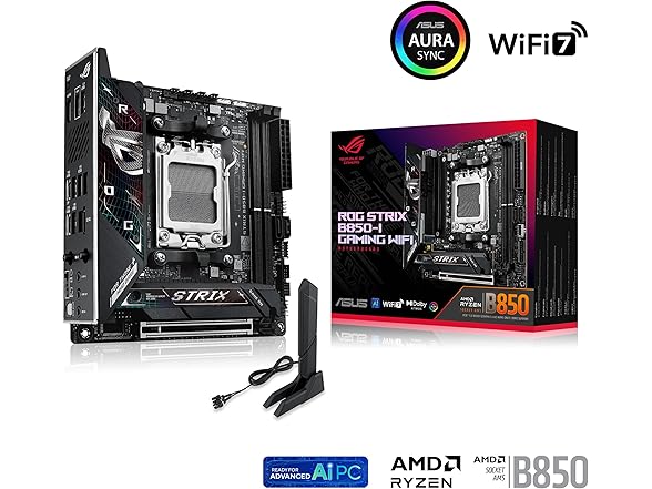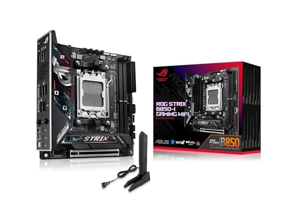 (1) ASUS ROG Strix B850-I WiFi Game, AMD Mini-ITX Motherboard, 10+2+1-Stage Power Supply, DDR5, PCIe 5.0 Slot with Q-Release Location, 2 M.2 Slots, WiFi 7 with WiFi Q Antenna, AI Advisor, AI Networking II