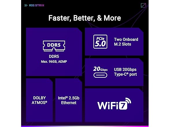 - High-performance network: Internal Wi-Fi 7 (802.11be) with ASUS WiFi Q-Antenna and Intel 2.5 Gb Ethernet