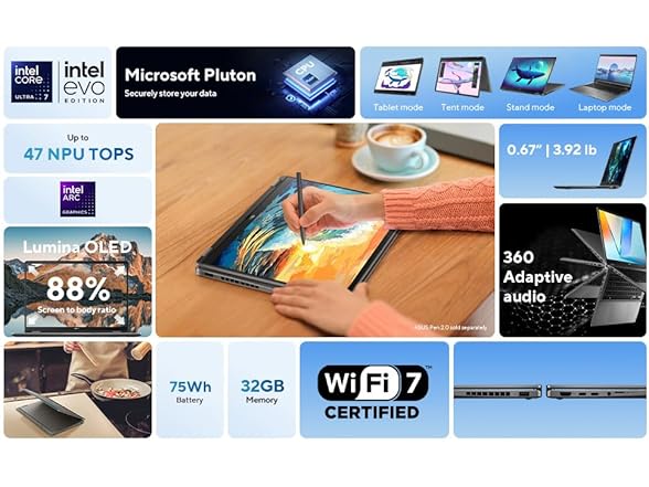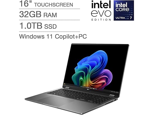 Processor & Memory: Intel Core Ultra 7 Processor 258V 32GB 2.2 GHz 32GB LPDDR5X Drives: 1TB PCIe G4 Solid State Drive Operating System: Microsoft Windows 11 Pro Communications: Wi-Fi 7(802.11be) (Tri-band)2*2 + Bluetooth 5.4 1080p FHD Camera, with Privacy Shutter Built-in Speaker and Microphone Smart Amp Technology Graphics & Video: 16.0" OLED WQXGA+(WQ+) 2880X1800 16:10 Bend+400nits(HDR) Glare DCI-P3:100% Intel Arc Graphics Keyboard: Backlit Chiclet Keyboard Precision touchpad Ports & Slots: 1x USB 3.2 Gen 1 Type-A 1x USB 3.2 Gen 2 Type-C with support for display / power delivery 1x Thunderbolt 4 with support for display / power delivery 1x HDMI 2.1 TMDS 1x 3.5mm Combo Audio Jack Micro SD card reader Power Supply: 75WHr Li-ion Battery TYPE-C, 65W AC Adapter, Output: 20V DC, 3.25A, 65W, Input: 100-240V AC 50/60GHz universal Dimensions: 13.98" W x 9.62" L x 0.67" H Approximate Weight: 3.92 lbs.