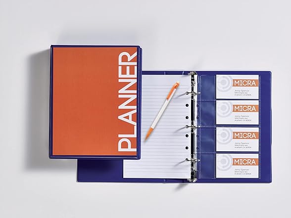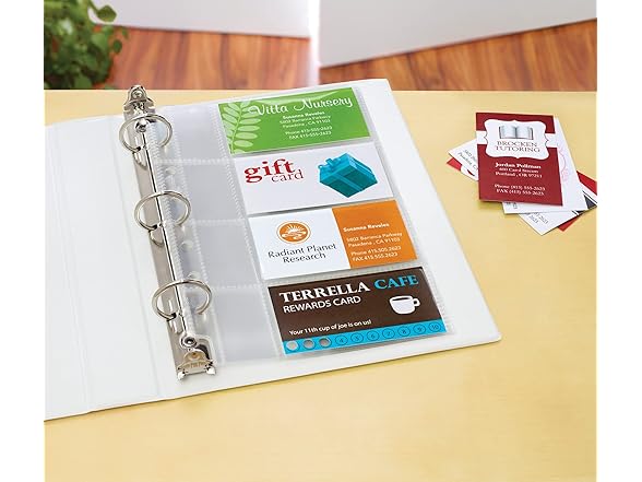Easily insert and remove cards from top load pockets; business card pages stay secure in three- or seven-ring mini binders with pre-punched binding