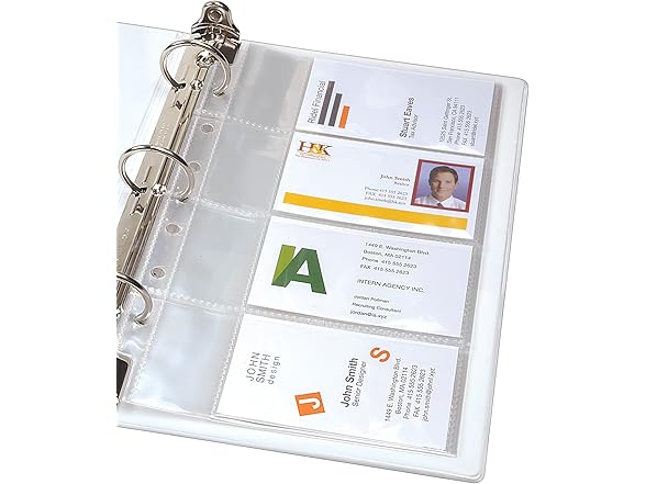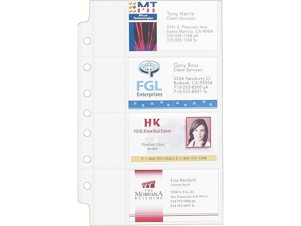 Find your contacts in a flash with Business Card Pages for your mini binder. Each business card page protector features a 7-hole punched edge for secure and convenient storage in any 3- or 7-ring mini binder while the top-loading pockets make inserting and removing cards quick and easy. The clear plastic material offers an unobstructed view of your cards so you can find what you need at a glance. Each double-sided card protector sleeve holds 8 cards, 4 on each side, and is made from acid-free and archival safe polypropylene that won't lift print and will keep cards protected from dirt, spills and tears. These clear card holder sleeves are great for organizing and storing all your business cards, ID cards, credit cards, rewards cards, social security cards, coupons and more. With these business card holder pages, organization becomes a simplified success. Item comes with a total of 5 clear page protectors.