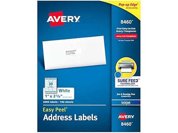 Avery address labels let you command complete control over all your bulk mailing, shipping, identification and organization jobs. Avery bright white labels blend better than basic labels on white envelopes. Avery labels provide better adhesion than basic labels with its UltraHold permanent adhesive that sticks and stays. Printers aren’t perfect, so we did something about it: These mailing labels are optimized for inkjet printers and use Sure Feed technology to provide a more reliable feed through your printer and prevent misalignments and jams. Say goodbye to wasted labels! These address labels have an Easy Peel design for quick application. The address labels are excellent for creating bulk mailing labels, organization labels, classroom labels and personalized gift tags for your wrapping paper, party favors or holiday cards. They’re also perfect for product packaging, filing, organizing items in your office, kitchen, closet, garage and classroom organization. Add a personalized touch to your custom address labels with thousands of free designs and templates on the Avery site. Make your mailing jobs easy, efficient and engaging using this pack of 3,000 label stickers.