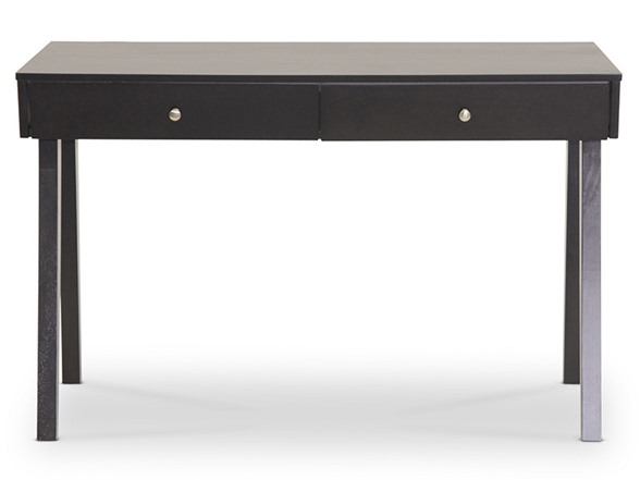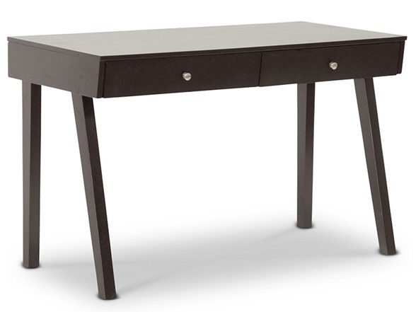 Well-placed angles and the beauty of simplicity make the Blaknell Designer Desk hard to resist. Subtlety is the name of the game with this home office desk: a frame of dark brown veneered rubberwood and engineered wood includes two unobtrusive desk drawers with the convenience of metal drawer slides and simple silver metal knobs. Slanted front legs give the contemporary desk its irresistible, understated allure.