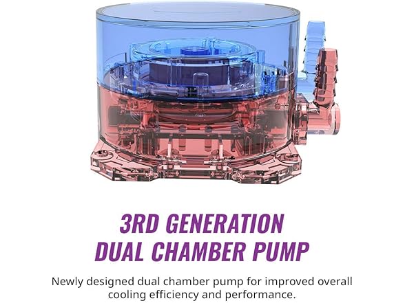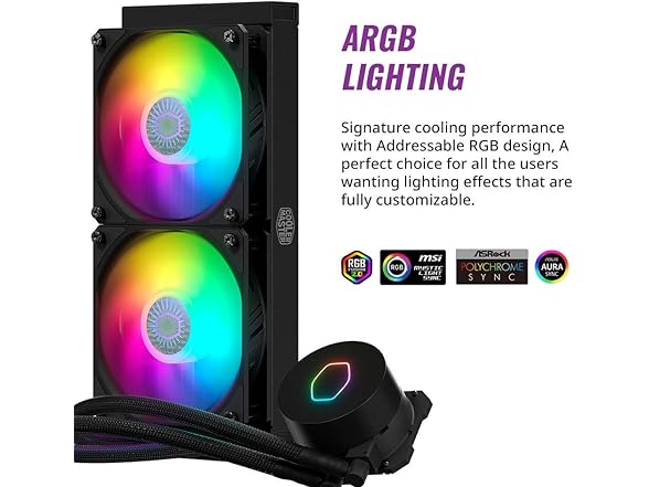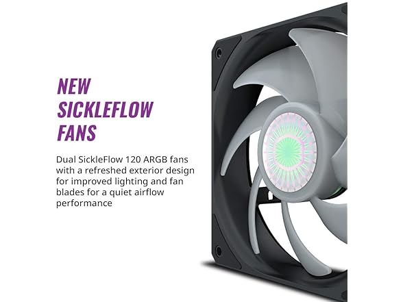 New design 3rd generation dual chamber pump to enhance the cooling effect of the entire AIO water cooled product. Increased radiator surface area improves heat dissipation and increases cooling efficiency. Equipped with a newly designed SickleFlow 120 ARGB fan that uses a quieter air balance fan blade that doesn't compromise air flow and pressure.