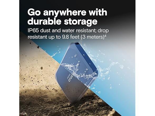 - Built to Last: Perfect for travel and all types of weather with IP65 dust and water resistance. Plus, it's drop resistant up to 9.8 ft (3 metres). This portable drive is designed for durability and reliability wherever you go