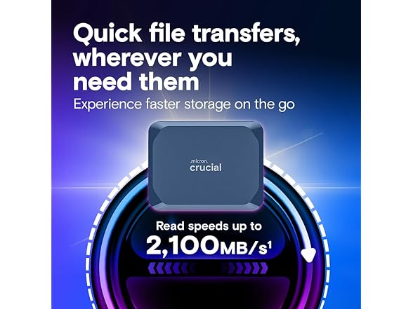 The Crucial X10 6TB Portable SSD (CT6000X10SSD9-02) provides high-performance storage with read speeds of up to 2,100MB/s, allowing for quick and efficient transfers of large files, including high-resolution photos, files, games, backups and videos. It is twice as fast as the Crucial X9! With its 6TB storage capacity, this external SSD is perfect for professionals, content creators, and gamers who need ample storage for their growing digital libraries. Built for portability and durability, the Crucial X10 is compact and lightweight, making it easy to carry wherever you go. Its IP65-rated dust and water resistance and drop protection from up to 9.8 feet ensure that your data remains safe in even the toughest conditions, whether you're travelling, working outdoors, or in harsh environments. The Crucial X10 is compatible with a wide range of devices, including PC, Mac, Android, and more, making it easy to transfer files across multiple platforms using USB-C connectivity. This combination of speed, capacity, and ruggedness makes the Crucial X10 6TB Portable SSD an excellent choice for users who need fast, reliable storage that can handle large file sizes and the demands of travel. With 45 years of memory and storage leadership, Micron engineered this external drive with rigorous testing and professional quality in mind.