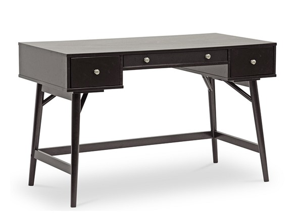 Stripped down, simplified, and reinvented, the Dunkirk Modern Desk is a new take on an old style. This sleek wooden desk starts with robust rubberwood and engineered wood and is finished with a very rich dark brown veneer. Ample storage space for workspace essentials is tucked away in three drawers, each resting on metal drawer slides and topped off with metal knobs.