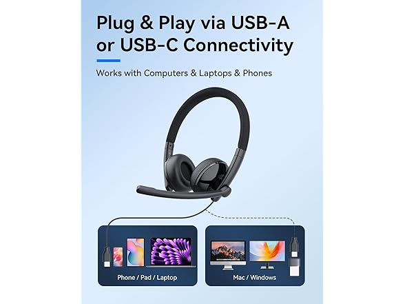 【USB Connectivity】This plug-and-play headset can be used with any device with a USB-A/USB-C port without any software installation. Compatible with PC/laptop/Tablet/Mac/iOS/Android phone and other devices.