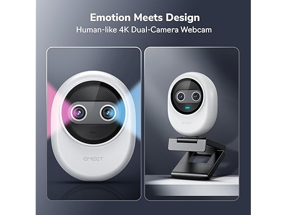 - Emotional Warmth, A Delightful Webcam Companion - EMEET Piko webcam 4K redefines webcams by blending practicality with emotional appeal. Its human-like dual-camera design fosters a delightful and warm connection, resembling friendly eyes that create a sense of companionship and approachability. Beyond 4K webcam capabilities, it doubles as a stylish desk setup. Piko video camera is the ideal companion for creators, trendsetters, and anyone seeking a personal touch in their tech.