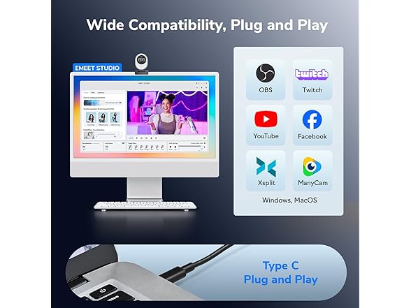 - Functional Harmony, Broad Compatibility - Compatible with Windows and MacOS, Piko webcam with microphone integrates seamlessly with OBS, Twitch, YouTube, and more, delivering a smooth experience across platforms. EMEET 4K webcam Piko supports USB C-C connectivity, providing fast and reliable performance for modern devices, from laptops to streaming setups. It adapts easily to beauty, gaming, and singing livestreams, remote work, online teaching, stylish desk setups, or as a high-aesthetic gift.