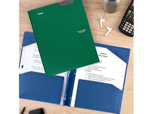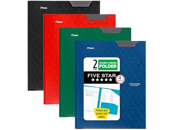 Five Star 2-Pocket Folder, 4 Pack, Plastic Folder with Stay-Put Tabs and Prong Fasteners, Holds 8-1/2" x 11" Paper, Black, Fire Red, Forest Green, Pacific Blue (38048)