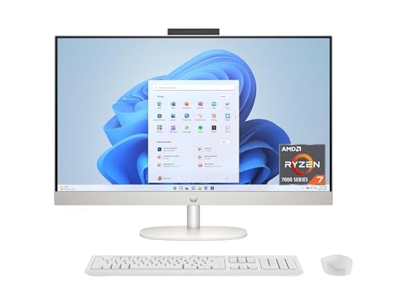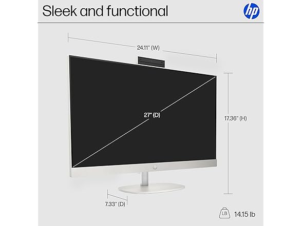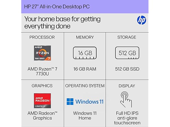 The HP 27 inch All-in-One Desktop is your home base for getting everything done. With a powerful AMD Ryzen 7 7730U processor, ample storage, speedy connections, and plenty of memory, you're all set to take on any day. Plus, this HP desktop is EPEAT Gold registered and ENERGY STAR certified. This HP computer comes with an HP white wireless keyboard, HP white wireless mouse, 90 W Smart AC power adapter, and setup instructions. HP is here to help. This HP computer comes with 1-year limited hardware warranty and 90-days limited technical support for software and initial setup.