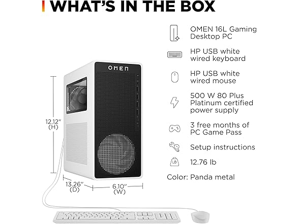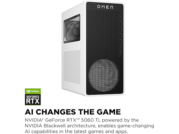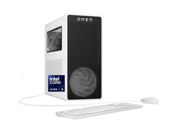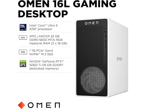 - HP OMEN 16L Gaming Desktop PC, Intel Core Ultra 5 225F, 32 GB RAM, 1 TB SSD, NVIDIA GeForce RTX 5060 Ti, Windows 11 Home, Microsoft Copilot, Panda Metal, TG03-0130 (2025)