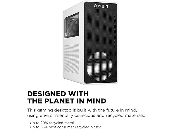 - MADE WITH THE PLANET IN MIND - The OMEN 16L Gaming Desktop PC is responsibly manufactured using up to 55% post-consumer recycled plastic and up to 20% recycled metal