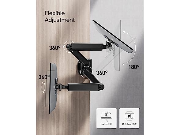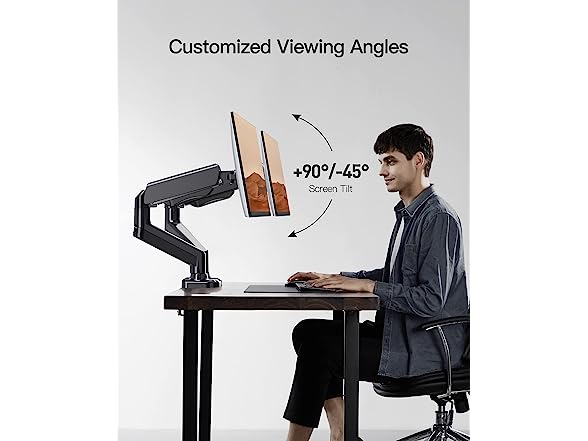 - Fully Adjustable Dual Monitor Stand: Dual monitor arm gives you an exceptional range of flexible movement, allowing your screen to swivel from -90° to +90°, tilt from -45° to +90° and rotate 360°. Adjustable monitor stand always cater to your center of vision and enjoy your work, play, or viewing time in a more comfortable environment.