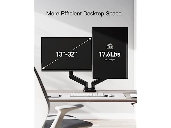 - Increased Stability for Larger Monitors: Strengthened dual monitor stand made of strong enough iron to ensure the safety and security of your dual monitor setup. So it can securely hold two 13”-32” screens weighing up to 17.6lbs. Compatible with VESA 75x75mm and 100x100mm.