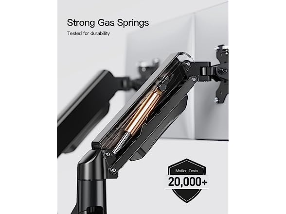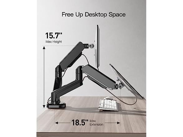 - Longer and Taller Monitor Stand for 2 Monitors: Both computer monitor arm extend 18.5" to the front and can be easily raised up to 15.7". Built-in premium gas spring provides a smooth height transition by perfectly balancing the weight of the monitor, providing you with more comfortable height adjustment.