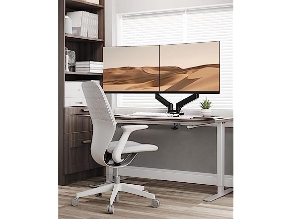 - Saves 1/3 of Desktop Space: Dual monitor mount can suspend your monitors above the desk to create a floating effect. A clean and tidy desk also offers you comfort at work. Say goodbye to messy wires, the integrated cable management system keeps your cords in order and out of sight.