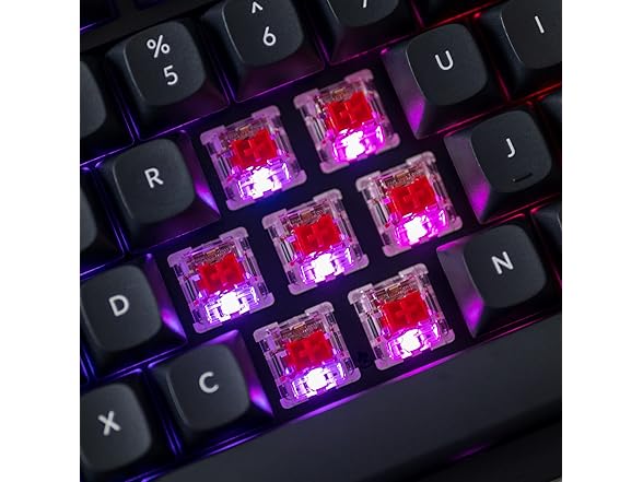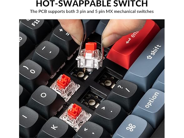 - Hot-swappable Support: With the pre-lubed mechanical linear red switch provides unrivaled tactile responsiveness with up to 50 million keystroke lifespan. You can also hot-swap the V6 with almost all of the 3pin and 5pin MX mechanical switches on the market (including Cherry, Gateron, Kailh, Panda, etc.) without soldering required. The PCB-mounted screw-in stabilizer for “big keys” such as space bar, shift, enter, and delete are designed for less wobbliness and smooth performance.