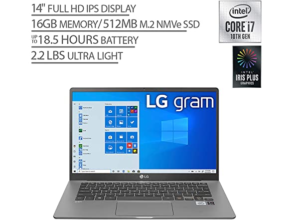LG Gram Laptop - 14" Full HD IPS Display, Intel 10th Gen Core i7-1065G7 CPU, 16GB RAM, 512GB M.2 MVMe SSD, Thunderbolt 3, 18.5 Hour Battery Life - 14Z90N (2020)