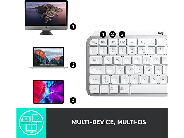 - Multi-Device, Multi OS: Pair MX Keys Mini compact keyboard with up to 3 devices on nearly any operating system via Bluetooth Low Energy and switch between them seamlessly