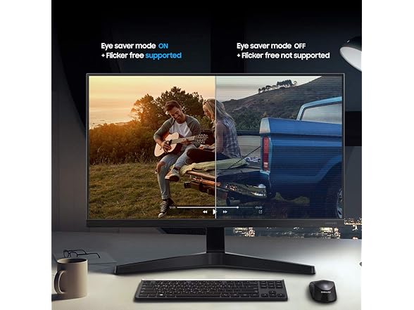 This monitor includes flicker-free technology alongside an Eye Saver mode that reduces blue light emissions to help reduce eyestrain and increase comfort when viewing the screen for extended periods of time.