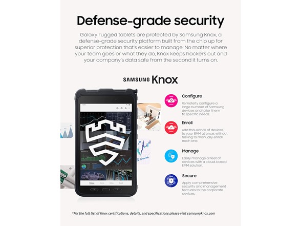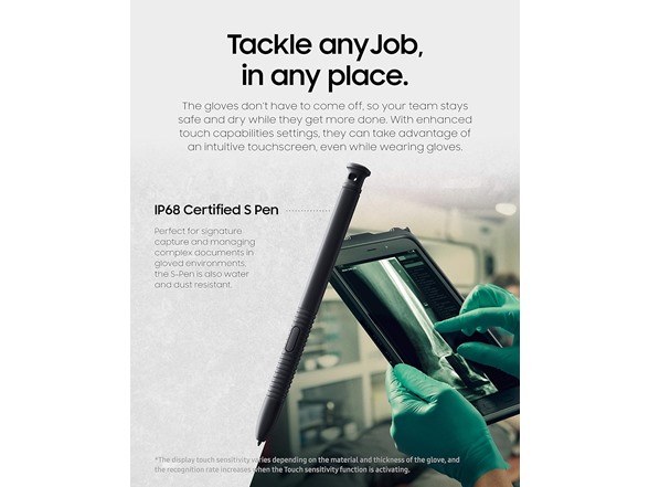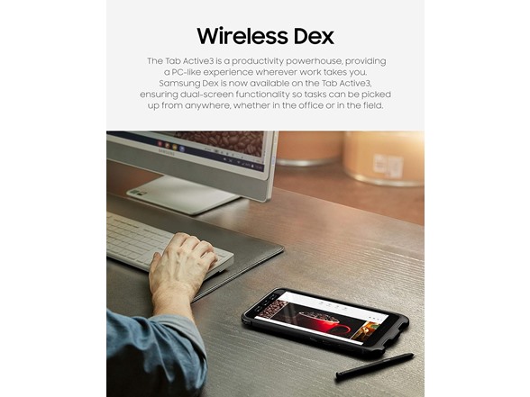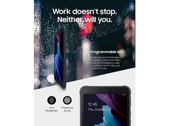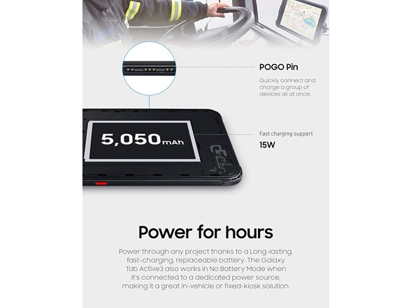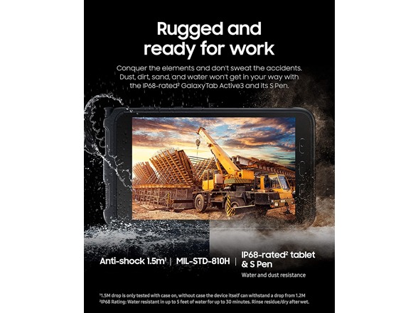 Compatible with Verizon, AT&T and T-Mobile Networks the MIL-STD 810H, IP68 S Pen + Anti Shock conquer the elements and don’t sweat the accidents. Dust, dirt, sand, and water won’t get in your way with the IP681 rated Galaxy Tab Active3 and its S Pen. It’s even MIL-STD-810H2 compliant, so you can drop it from a height of 1.5M and it’ll absorb the shock. The Galaxy Tab Active3 works in No Battery Mode when it’s connected to a dedicated power source making it a great in-vehicle or fixed solution.