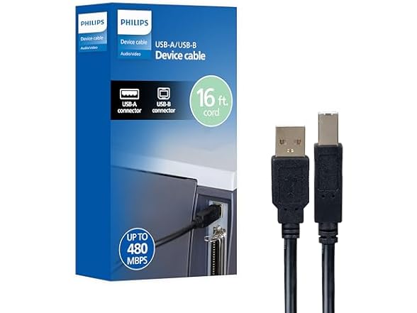 Philips USB-A to USB-B Printer Cable, 16 Ft Long Cord, Connect Laptop or Desktop, Data Transfer 480 Mbps, Gold Plated, HP, Canon, Brother, Samsung, Dell, Epson, Lexmark, Xerox, Black, SWV3173B/37