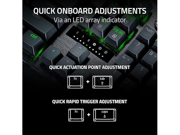 - QUICK ONBOARD ADJUSTMENTS — Make precise, on-the-fly adjustments to actuation height or Rapid Trigger sensitivity with the visual aid of an onboard LED array while saving the settings to the keyboard with no software required