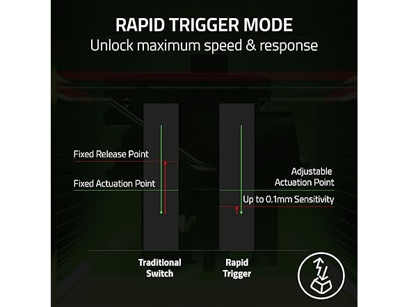 - RAPID TRIGGER — A step up from traditional mechanical or optical keyboards to achieve the most responsive and precise inputs; reset keys at the slightest lift of a finger, and experience an advantage in speed that is especially useful for movement in competitive FPS games