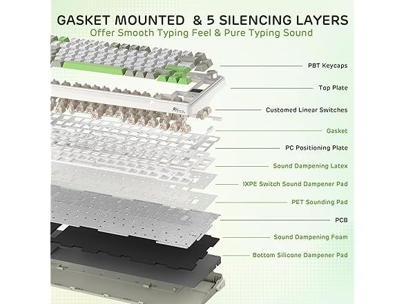 - Five Sound-Dampening Layer — With five layers of internal padding, including 2 layers of thick sound-absorbing foams, an IXPE switch pad, silicone dampener and PET sound-enhancement film, this keyboard structure significantly minimizes hollow sounds and cavity noise, delivering a super smooth and satisfying typing experience.