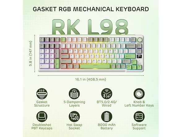 - Gasket Structure with PBT keycaps — Experience a premium typing feel with the RK L98's gasket-mounted structure, offering a soft, cushioned touch and reduced vibrations for all-day comfort. Paired with durable, oil-resistant Cherry profile PBT keycaps for enhanced typing feel, perfect for both work and game.