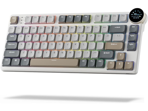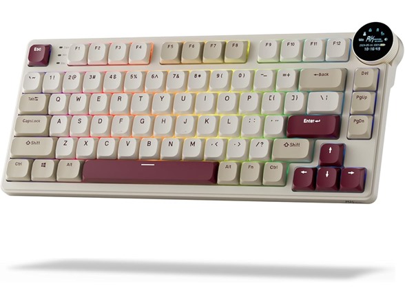 - Compact Screen, Intuitive Knob Control — RK N80 wireless keyboard redefines versatility. A dynamic display showcases custom GIFs, dates, connection modes, WIN/MAC layouts, and battery status on its small screen. Effortlessly control volume, connection modes, backlit brightness/speed, and RGB modes/colors with a simple twist or click of the knob.